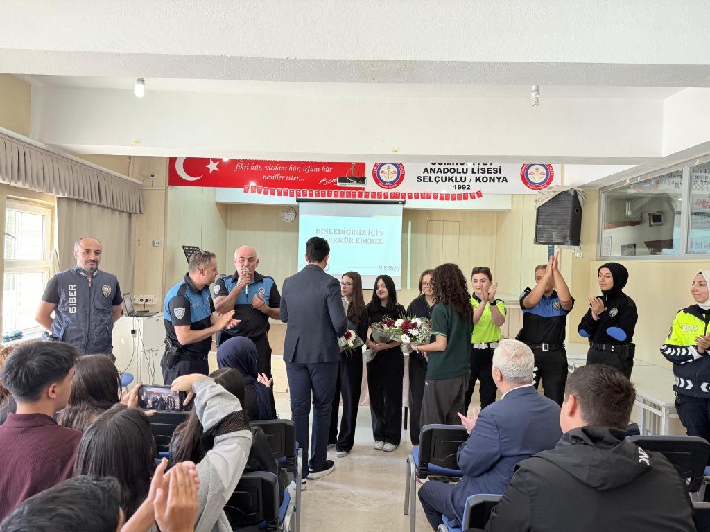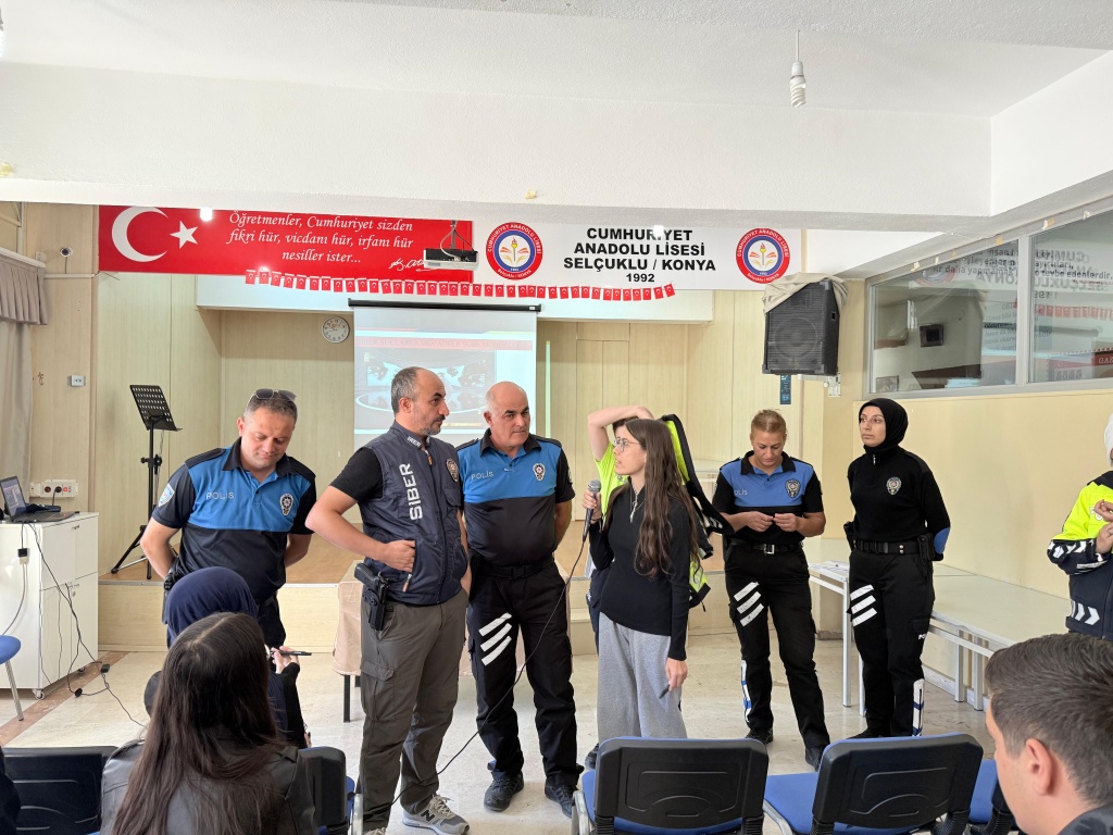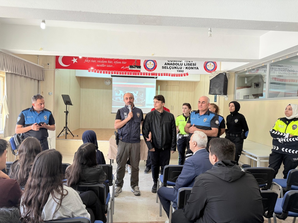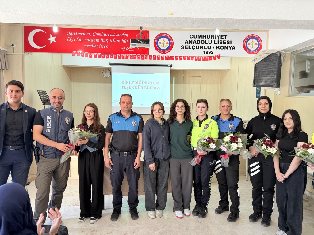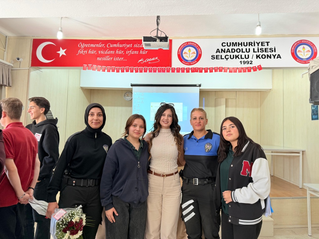 Konya İl Emniyet Müdürlüğü Toplum Destekli Şube Müdürlüğü, Siber Suçlarla Mücadele Şube Müdürlüğü ile Trafik Denetleme Şube Müdürlüğü 'nün Kahraman Polisleri TEKNOLOJİ BAĞIMLILIĞI konusunda öğrencilerimizi bilgilendirmek için okulumuzu ziyaret ettiler. Değerler Kulübü olarak Kahramanlarımıza çok teşekkür ediyoruz. Emeklerine sağlık.